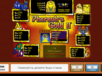 Древний Египет неизменно влечет поклонников тайн и авантюрных приключений. Поэтому и игровой автомат Pharaoh’s Gold II непременно понравится всем любителям Египта и всего того, что с ним связано. Этот слот посвящен фараонам и их богатствам. Гемблерам, которые выберут для себя эмулятор Золото фараона 2, предстоит посетить египетские пирамиды и озадачиться поиском сокровищ. Итогом путешествия станет получения богатства, которое позволит существенно улучшить материальное положение.